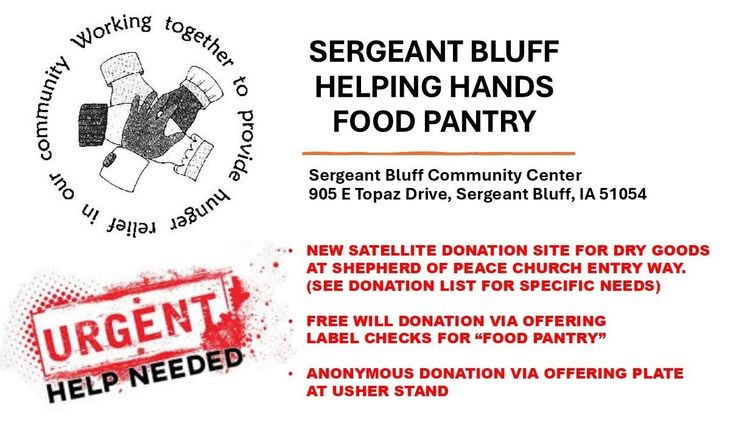 The following list are items that the Food Pantry cannot get easily from the Food Bank of Siouxland anymore. This list may seem excessive but it reflects on how short they are with food items at this time. Donors can drop off any of these items at the church entry way designated satellite location Mon-Thu 10a-2:30p, Wed 6-8p or Sun 8a-11a: